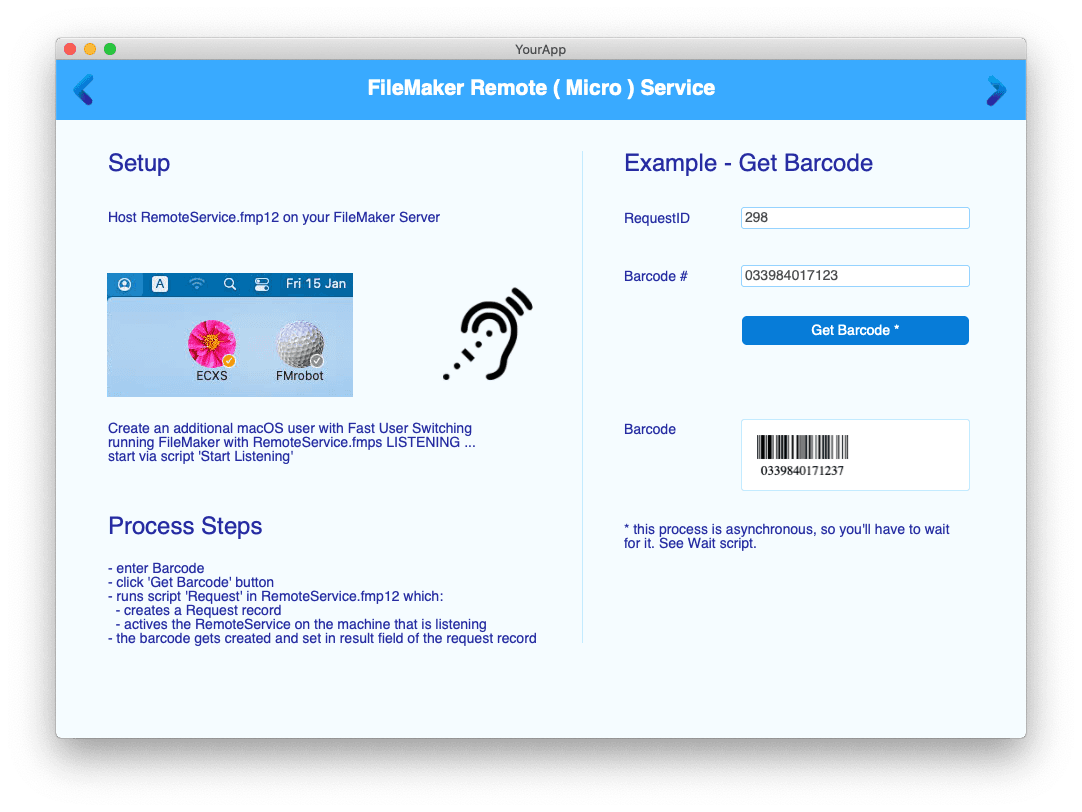 I really like cutting larger projects into small, manageable bits as well a being able to re-use functionallity. This small app is the result of a few ‘thinking out of the box’ bits that finally came together. The challenge was to built a FileMaker ‘micro service’ that could serve FileMaker’s 19 JavaScript kinda server side. The advantage being that the JavaScript code only has to be build and tested on one OS but can be can be served to all platforms. It would also eliminate the risk of users accidentally interupting ‘Perform JavaScript in Web Viewer’ and client side scripts being interrupted by FileMaker.PerformScript. Although temporary, a nice side effect is that also older FileMaker clients can benifit from the additional JavaScript functionallity. The system is based on macOS’ Fast User Switching and the PSoC (Perform Script on Client) technique by Jan Stieperaere. Here you can download the RemoteService